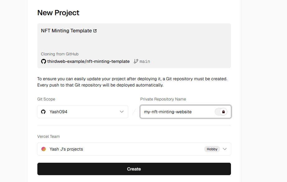 • Repository Name: Enter a name (e.g., my-nft-minting-website)