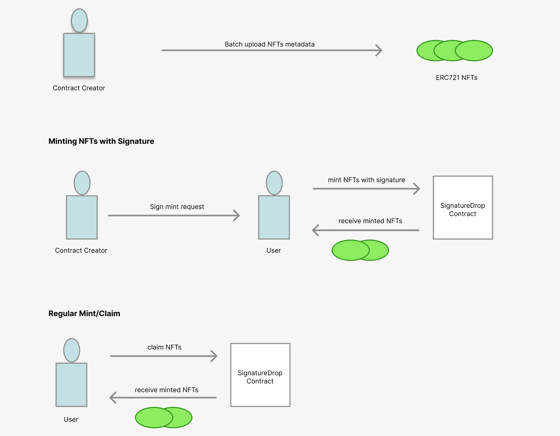 Any external party can then present a smart contract implementing the 'signature minting' mechanism with a payload, along with the signature generated from a contract admin signing the payload. Tokens will then be minted according to the information specified in the payload.